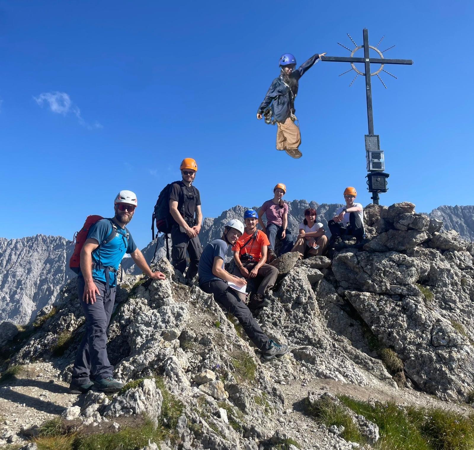 Unser Ziel: die Coburger Hütte, welche jedoch nur durch einen schweißtreibenden Zustieg zu erreichen ist. Neben einer Pause mit Zugspitzblick sorgt der Dreh erster Hochkant-Kurzvideos unter der fleißigen Mithilfe unserer Jugendleiter für gute Unterhaltung. Nach einer schnellen Stärkung und Wiederholung der MSL-Techniken fallen wir- in freudiger Erwartung, diese anzuwenden- ins Bett. Um zu unserer ersten Mehrseillänge zu gelangen, müssen wir erstmal, wie echte Bergsteiger den Weg selbst suchen. Während die einen den Einstieg der Route suchen, suchen die anderen ihre Exen. Doch in keinem Fall ist Panik nötig, so finden wir beides. Wir steigen in Zweierseilschaften in die Tour ein, wogegen Sven und Marius wie geschickte Bergziegen um uns herumkraxeln und unsere erlernten Techniken immer wieder überprüfen. So meistern wir erfolgreich unsere teils erste MSL-Tour. Bei schönem Wetter entspannen wir auf dem Gipfel und verspeisen selbstgemachte Müsliriegel(krümmel). An einen direkten Abstieg ist nicht zu denken - die Frage ist nur: Welcher Gipfel wird noch erklommen? Die Entscheidung fällt auf den Vorderen Tajakopf. Wir gelangen mit nicht nur ein bisschen Qual und Beschwerden zum Gipfelkreuz, wo uns die Aussicht den Atem raubt.